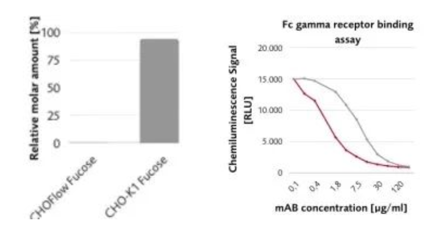 除已有的CHOzen®細(xì)胞系和GLYCOEXPRESS® (GEX®)細(xì)胞系外,漢騰生物新推出的巖藻糖基轉(zhuǎn)移酶8敲除的CHO細(xì)胞系,可賦予重組表達(dá)的單抗無(wú)巖藻糖修飾的特性。該細(xì)胞系在產(chǎn)量和生長(zhǎng)與野生型CHO K1一致的條件下,無(wú)巖藻糖抗體與FcγRs抗原親和力提高,ADCC效應(yīng)加強(qiáng)。