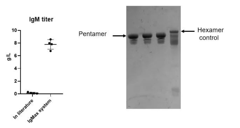 漢騰生物具備高表達(dá)IgM的經(jīng)驗(yàn),經(jīng)過(guò)載體系統(tǒng)改進(jìn)及生產(chǎn)工藝的優(yōu)化后可提高lgM表達(dá)量,最高可達(dá)8g/L。其中,IgMaxTM表達(dá)載體平臺(tái)和IgMasterTM工藝平臺(tái)是漢騰生物自主研發(fā)的IgM相關(guān)開(kāi)發(fā)平臺(tái),其具備了高產(chǎn)量、高純度和高效價(jià)的特點(diǎn),技術(shù)轉(zhuǎn)移路線清晰,可滿(mǎn)足大規(guī)模生產(chǎn)的需求。此外,理化分析、生化分析、制劑開(kāi)發(fā)和生產(chǎn)能力也均配套完善,可有效解決IgM的產(chǎn)業(yè)化難題。