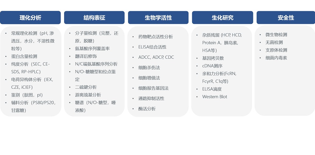 分析方法開發(fā)團隊擁有先進的儀器設備,具備豐富的單抗,雙抗和重組蛋白等pCQA分析與監(jiān)控的經(jīng)驗,為新藥和仿藥研發(fā)以及IND/BLA申報提供一站式全流程服務,包括: