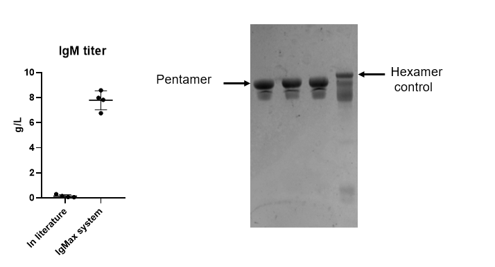 在細胞株構建階段,漢騰生物研發(fā)團隊選擇了具有最高穩(wěn)定性和特定生產力的CHO細胞系作為最終的先導克隆,并且通過調節(jié)載體比例改變產生的抗體滴度。漢騰生物IgMaxTM表達載體平臺最高可以達到8g/L的產量,并且IgM構型均一,其中,五聚體比例接近100%,幾乎無六聚體產生(IgM有五聚體和六聚體形式,包含開放J鏈的五聚體形式是開發(fā)和生產IgM的目標構型)。