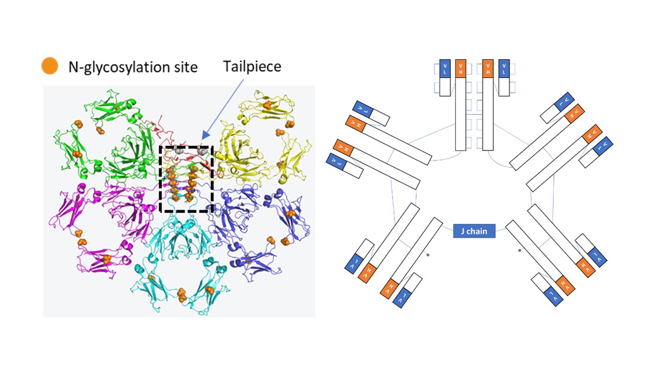 免疫球蛋白M(IgM)是人類免疫系統(tǒng)自然產生的抗體,是由一個有J鏈組成的五聚體。與傳統(tǒng)的IgG抗體相比,IgM有一些獨特的特征:IgM有10個結合位點(IgG抗體只有2個),因此IgM具有更強的抗原結合能力?!禢ature》曾報道,鼻腔給藥IgM可防護SARS-CoV-2多個病毒變種的入侵,其最高中和效力是IgG的230多倍。