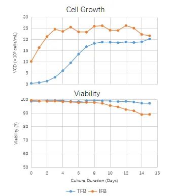 加強(qiáng)型補(bǔ)料培養(yǎng)(IFB)和常規(guī)補(bǔ)料培養(yǎng)(TFB)細(xì)胞生長(zhǎng)及活率對(duì)比