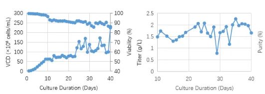CHO細(xì)胞(表達(dá)單抗)40天灌流培養(yǎng)的細(xì)胞生產(chǎn)及活率