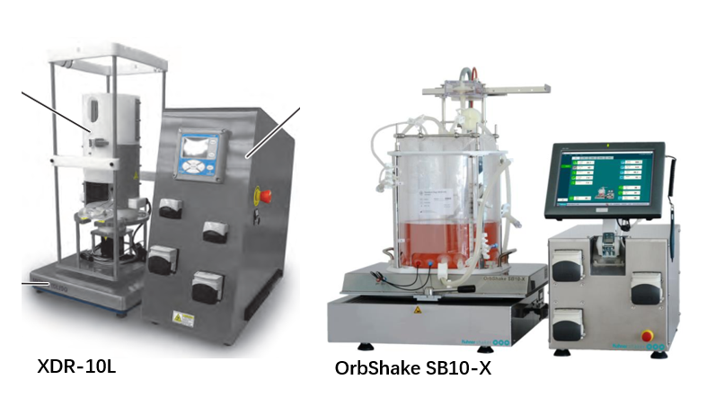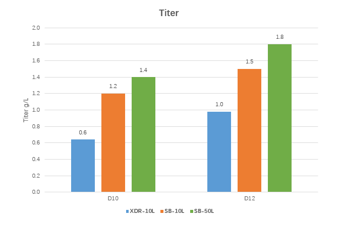 漢騰生物擁有國內(nèi)獨有的環(huán)軌搖晃式生物反應器平臺,該平臺具有低剪切力,高氧傳質(zhì)效率,并具有良好的搖瓶至2500L規(guī)模放大一致性等優(yōu)點。同時由于特殊的培養(yǎng)方式,該平臺適合對剪切力敏感的蛋白生產(chǎn)(包括重組蛋白,雙抗等)。本案例中切換至10L環(huán)軌搖晃式反應器(OrbShake SB10-X),相對傳統(tǒng)10L攪拌式反應器(XDR-10L),表達量提升50%;另外,在OrbShake SB10-X放大至OrbShake SB50-X中,單位體積內(nèi)表達量也提高了20%。