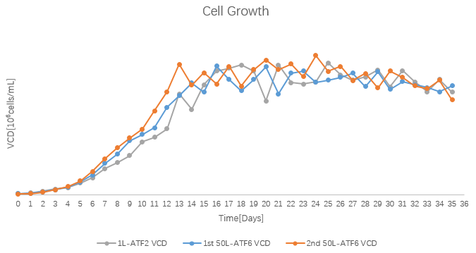 漢騰生物已建立了成熟的灌流工藝平臺,能夠?qū)崿F(xiàn)1L至200L規(guī)模的灌流工藝開發(fā)及生產(chǎn)。本案例中,通過對早期開發(fā)數(shù)據(jù)的分析,順利的在同規(guī)模(1L)實現(xiàn)工藝重復及確認,并成功放大至50L生產(chǎn)規(guī)模,成功幫助客戶完成了灌流工藝項目的引入及生產(chǎn)。