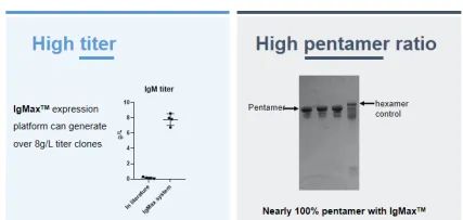 IgM類抗體一般呈五聚體結(jié)構(gòu),分子量大,糖基化位點(diǎn)多,結(jié)構(gòu)復(fù)雜,單克隆細(xì)胞株構(gòu)建和工藝開發(fā)難度大。漢騰生物團(tuán)隊(duì)在前期的細(xì)胞株構(gòu)建階段,結(jié)合IgM平臺(tái)專有載體系統(tǒng)篩選優(yōu)化獲得了高產(chǎn)細(xì)胞株,產(chǎn)生的五聚體比例可高達(dá)100%,幾乎無六聚體產(chǎn)生,減少工藝開發(fā)難度。