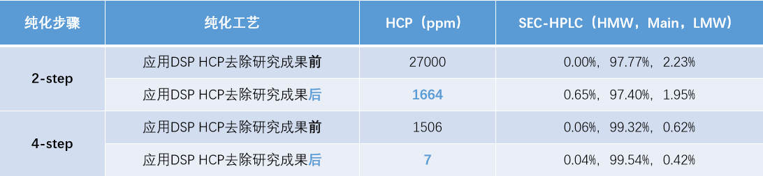 無論采用2步層析工藝抑或4步層析工藝,應(yīng)用DSP關(guān)于HCP去除的研究成果后,此項(xiàng)目產(chǎn)品中的HCP殘留均大幅下降,SEC純度保持不變。有效清除了工藝殘留雜質(zhì)(HCP 低于10ppm;對比已上市同類別產(chǎn)品的900ppm有顯著下降)。