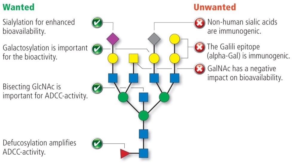 GlycoExpress® (GEX®)細(xì)胞系可賦予天然蛋白、抗體、融合蛋白等多種重組生物大分子蛋白復(fù)雜的人源糖基化特征,從而降低非人源糖基化特征的負(fù)面影響,滿足復(fù)雜糖蛋白的臨床開發(fā)需求。同時(shí)利用細(xì)胞工程、生物信息學(xué)、系統(tǒng)生物學(xué)及合成生物學(xué)技術(shù),開發(fā)出SIALOMAX®、FUCOFLEX®、SIALOFLEX®三種專門針對(duì)唾液酸、巖藻糖和甘露糖修飾調(diào)節(jié)的細(xì)胞系,對(duì)于所表達(dá)的目標(biāo)蛋白可達(dá)到延長(zhǎng)半衰期、增強(qiáng)活性、增強(qiáng)ADCC效應(yīng)等效果。