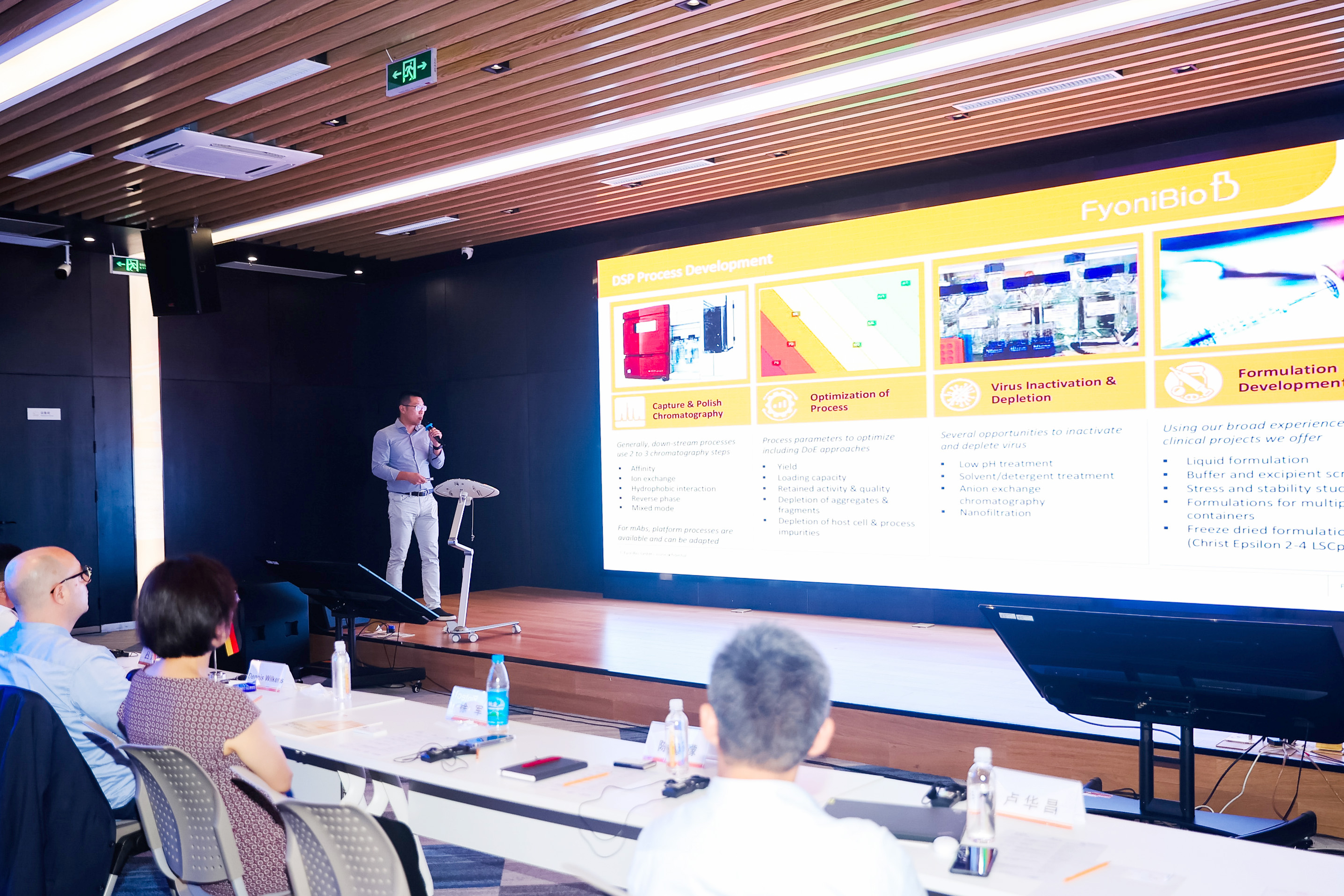 交流會(huì)上,沈?yàn)t博士分享了漢騰生物以及旗下德國(guó)子公司FyoniBio GmbH(簡(jiǎn)稱“FyoniBio”)的企業(yè)發(fā)展和業(yè)務(wù)范圍。漢騰生物是一家國(guó)際化運(yùn)營(yíng)的生物藥CDMSO企業(yè),F(xiàn)yoniBio是漢騰生物位于德國(guó)柏林的研發(fā)基地,專注于生物藥開發(fā)及分析服務(wù),可提供細(xì)胞株開發(fā)、上下游工藝開發(fā)、分析方法開發(fā)及臨床樣品檢測(cè)等專業(yè)服務(wù)。沈?yàn)t博士指出,F(xiàn)yoniBio 核心團(tuán)隊(duì)成員具備20年以上的生物制藥開發(fā)經(jīng)驗(yàn),與國(guó)內(nèi)漢騰生物團(tuán)隊(duì)有密切的技術(shù)交流,不斷提升技術(shù)實(shí)力。