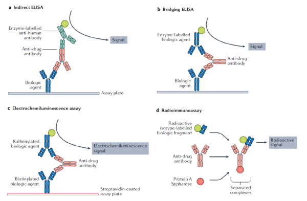 因于免疫原性會(huì)嚴(yán)重影響藥物的有效性和安全性,藥監(jiān)部門要求所有生物治療性藥物都要進(jìn)行免疫原性檢測(cè),F(xiàn)DA對(duì)免疫原性的檢測(cè)給出的具體要求:高靈敏度、高特異性、高穩(wěn)定性及高親和力。ADA的檢測(cè)和確認(rèn)比較復(fù)雜,檢測(cè)結(jié)果會(huì)受到所使用的分析方法的影響。目前評(píng)估免疫原性的方法學(xué)包括不同類型的免疫分析平臺(tái):如傳統(tǒng)酶聯(lián)免疫吸附分析(ELISA, 圖1a、b)、電化學(xué)發(fā)光免疫分析(ECL, 圖1c )和放射免疫分析(RIA, 圖1d),以及不同的ELISA檢測(cè)形式,如直接、間接、橋接和競(jìng)爭(zhēng)ELISA等。