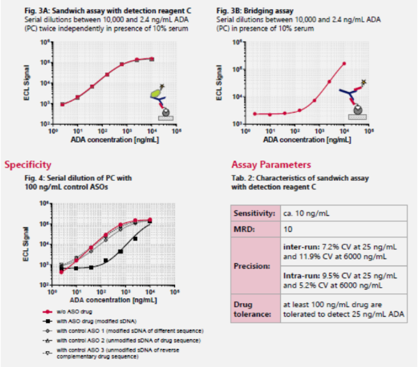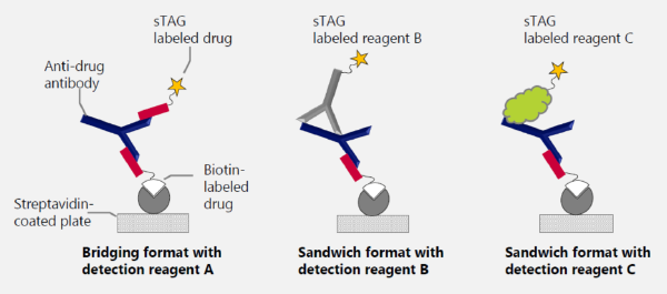 FyoniBio基于Meso Scale Discovery (MSD) 的電化學(xué)發(fā)光(ECL)平臺(tái)檢測(cè)臨床樣品中的ADA。并分別對(duì)橋式和雙抗夾心ELISA形式進(jìn)行檢測(cè)評(píng)估。在酸解預(yù)處理后,使用生物素化的ASO藥物作為捕獲試劑,然后將待檢樣本加到鏈霉親和素涂布的平板上,釕離子(sTAG)標(biāo)記的ASO藥物或檢測(cè)試劑A、B和C用于檢測(cè)(圖2)。
